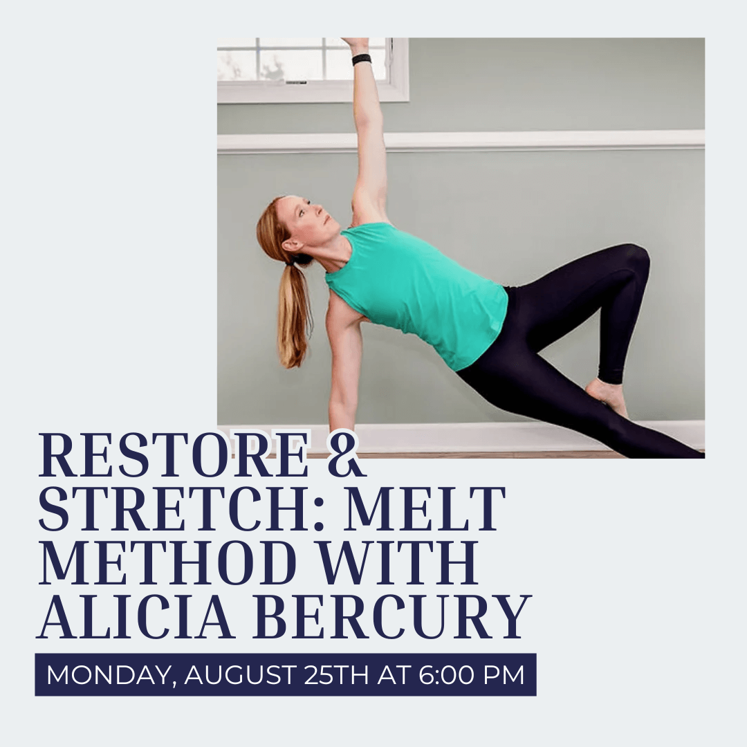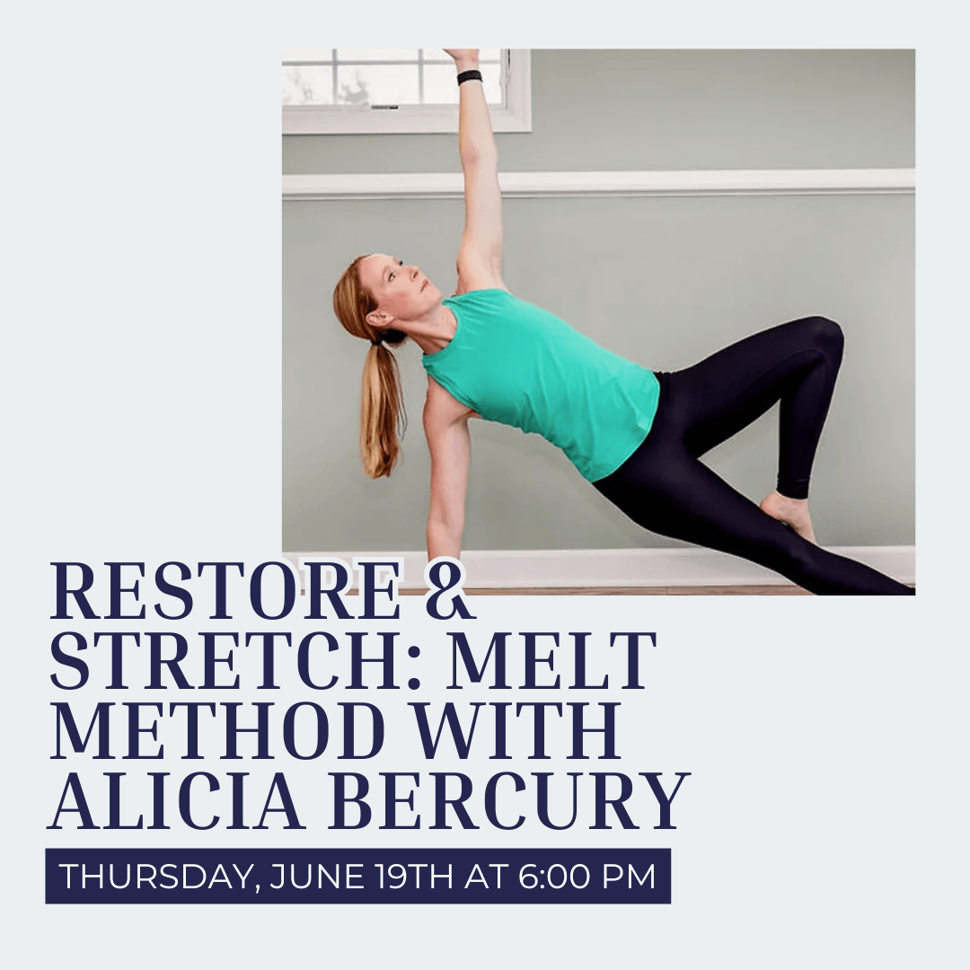 6:00-7:00 PM Join Alicia Bercury for a Restore Stretching class - aka the Melt Method.