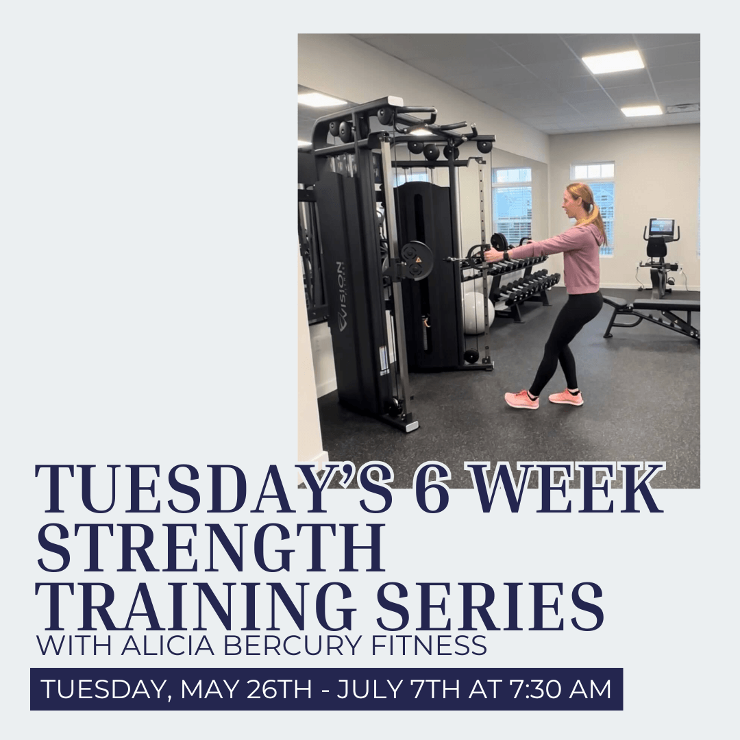 Join us for our Tuesday strength training series with Alicia Bercury Fitness. May 26th through July 7th. Embark on a transformative journey to unlock your full potential with our 6-part Strength Training Series. You'll delve into dynamic workouts targeting different muscle groups, mastering proper form and technique along the way. Whether you're a beginner or a seasoned gym enthusiast, this series offers something for everyone, providing a supportive environment for growth and achievement. Join us and elevate your fitness journey to new heights.