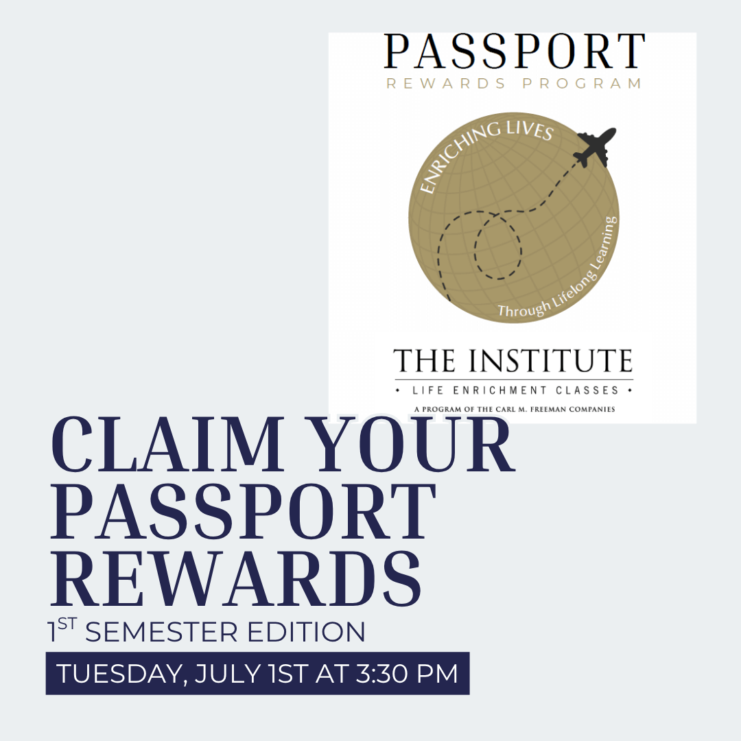 10:00 AM - 11:30 AM The end of The Institute's Passport Rewards 3rd Semester is quickly approaching. For all those Institute participants that received 6 stamps (6 attended classes) will be receiving a special gift from The Institute.